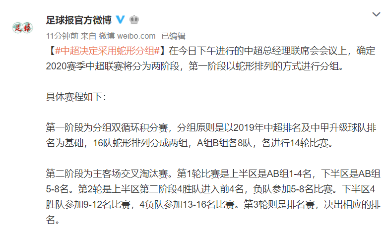 北京时间5月13日,中超总经理联席会会议上,确定2020赛季中超联赛将分为两阶段,第一阶段以蛇形排列的方式进行分组。第二阶段则是主客场交叉淘汰赛。球迷们开始了吐槽。