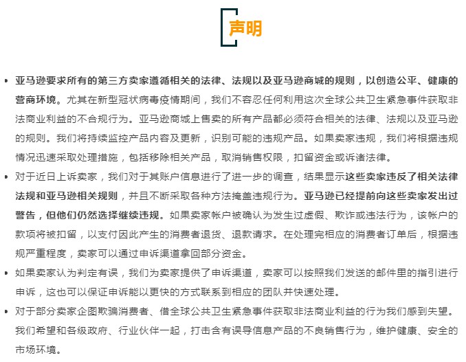 亚马逊方面表示,亚马逊要求所有的第三方卖家遵循相关的法律、法规以及亚马逊商城的规则,以创造公平、健康的营商环境。其也希望与各级政府、行业伙伴一起,打击含有误导信息产品的不良销售行为,维护健康、安全的市场环境。