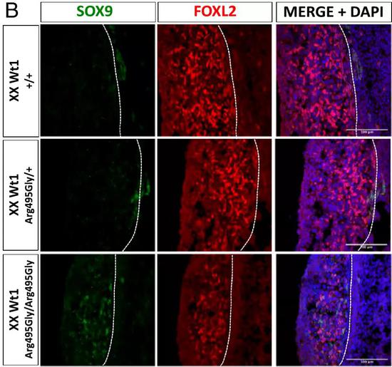 为了进一步地验证这一基因突变的后果,研究人员选择性染色体为XX的小鼠,通过基因编辑手段改变了表达WT1蛋白的ZF4结构。随后,他们发现这些雌性小鼠出现了雄性特征,相比于正常雌性小鼠,它们表达FOXL2蛋白的细胞明显减少,蛋白的表达量下降80%以上。考虑到β-连环蛋白、FOXL2蛋白(XX)以及SOX9蛋白(XY)在哺乳动物性腺发育中的关键作用,研究人员认为WT1蛋白上ZF4结构的突变及其带来的后续影响,不仅是导致雌性小鼠,更是导致女性患DSD的主要原因。