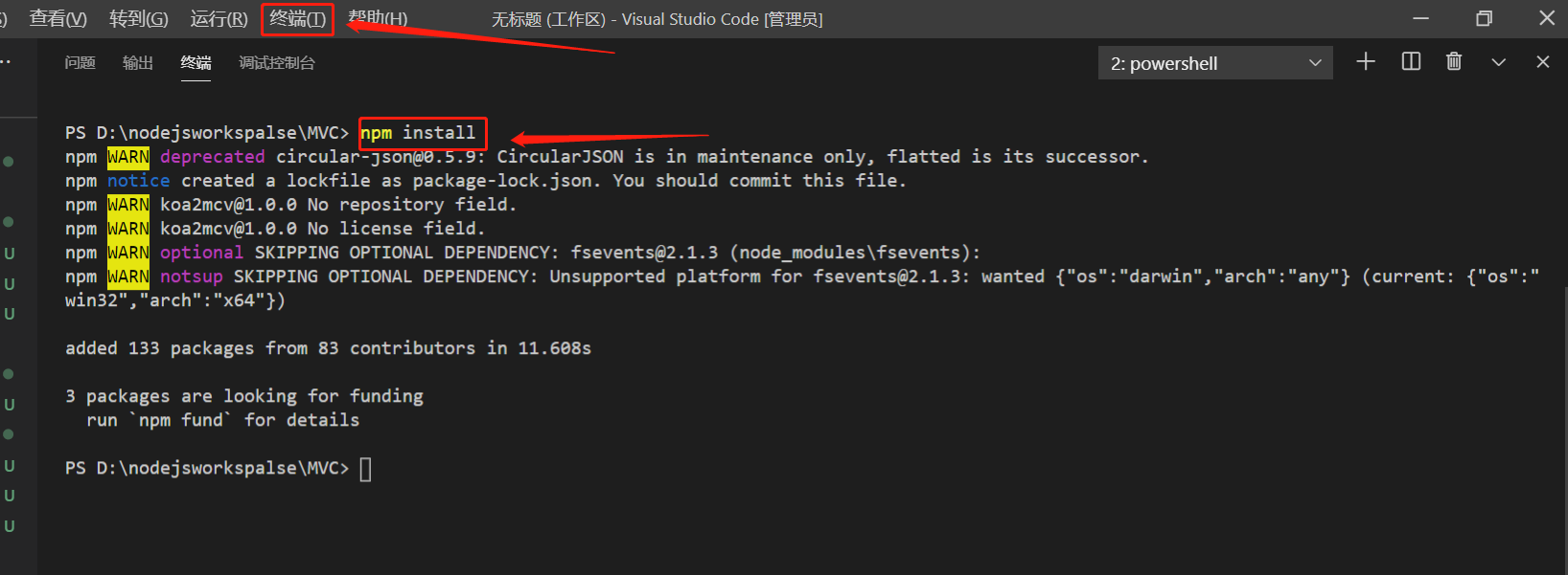 4、项目结构构建结束,接着引入所有依赖包,在终端中执行'npm install' ,会下载package.json中dependencies所有包,以及这些包所依赖的包。