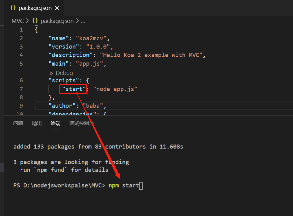 参数介绍:name项目名称、version版本号、description项目描述、main项目启动文件、scripts启动快捷设置,author作者,dependencies第3方中间件名称及版本。
