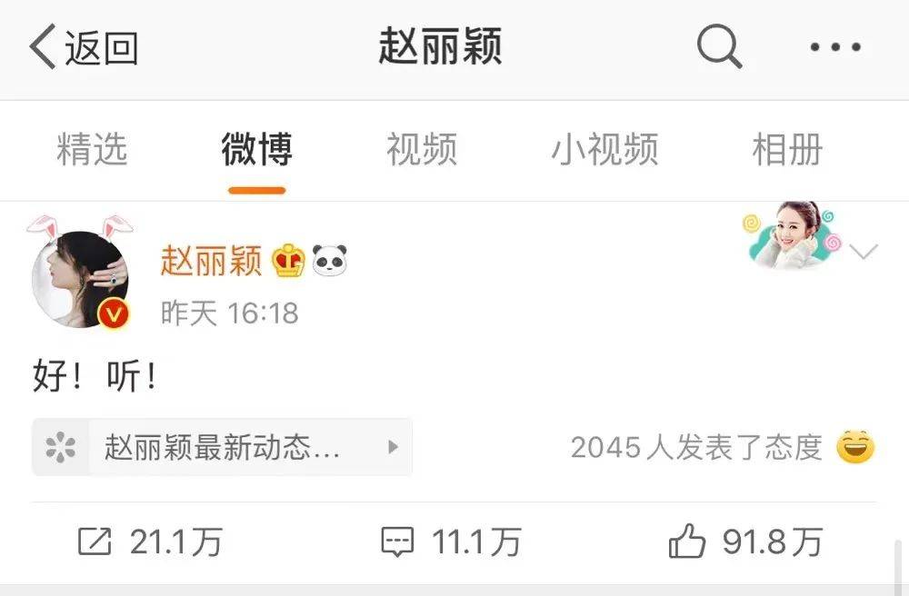 然后没多久赵丽颖就发博了,简简单单俩字:好!听!