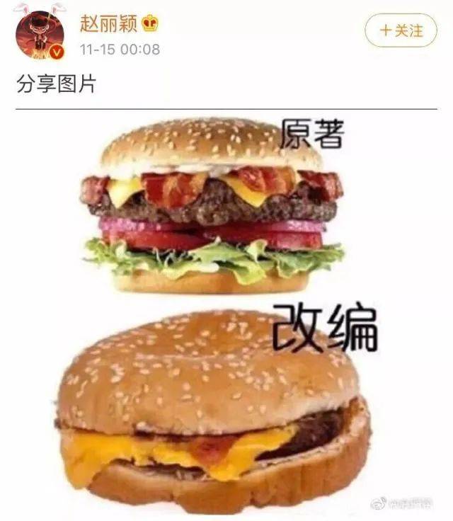 因为拍摄期间赵丽颖曾经发了这么条微博,图片里面原著是一个配料丰富的汉堡,但到了改编这里则变成一个没什么内容的扁平汉堡了...