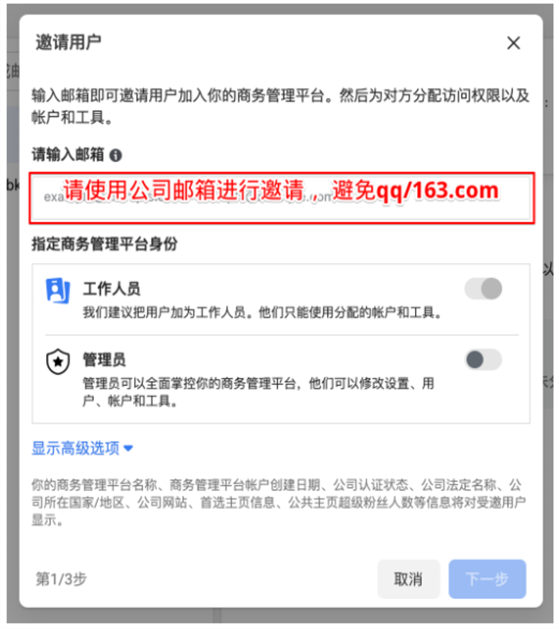 • 用户权限和管理:必须添加最起码两个管理员• 只添加公司员工到管理平台,双重验证: 必须全员设置开启双重验证, 以提高账户安全性• 资产创建、拥有权和管理 如:Facebook粉丝页、 像素、IG账户、APP等等)• 公司验证: 如需访问特定 Facebook 产品,广告主才需要完成验证