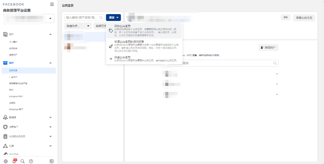 • 广告主可以通过开户平台链接进入BM里创建Facebook公共主页 (粉丝页)• 在BM中直接创建粉丝页-新建公共主页• 通过个人账户创建主页,个人账户拥有管理员权限,可以认领到BM中-添加公共主页• 申请"他人"的公共主页权限-申请公共主页访问权限