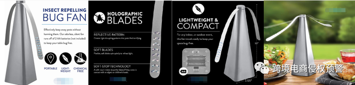P.S.这款驱蝇器也是比较小众的一款产品,其有如此高的销量跟排名,算是卖的非常好的一款了。以上专利除去扇叶部分与其不同以外,整体的话是一致的,所以有一定侵权风险,还有就是这款该美国外观权利人在欧盟也有申请相同外观专利,专利图就不展示了(整体跟美国外观专利图一致),所以有在欧美站点销售相关产品的卖家,都要注意下此款外观,因为都有侵权风险!