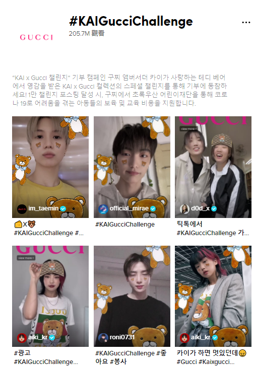 这个系列由Gucci创意总监Alessandro Michele亲自操刀设计,对"泰迪熊"有着独特情感的KAI也参与了构思。为了推广可爱的泰迪熊联名系列,在今年3月,Gucci与KAI一起发起#KAIGucciChallenge标签的挑战赛。如果这场挑战赛的标签能够在一定的时间内达到1万个,Gucci将通过绿雨伞儿童基金会支援受科罗纳19困难儿童的保育及教育费用。这项活动的开启是非常有意义的!