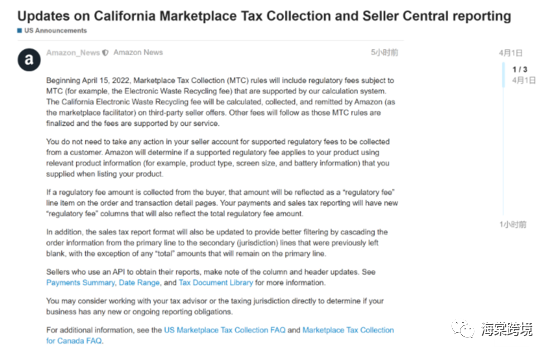而在4月15日的这次更新之后,MTC规则将会有更多的收费项,亚马逊官方的举例就是加州地区专有的一个电子废品回收费,在更新后就会划入MTC规则,根据规则亚马逊会对相关类目的产品卖出时,向买家收取一次性电子废品回收费。