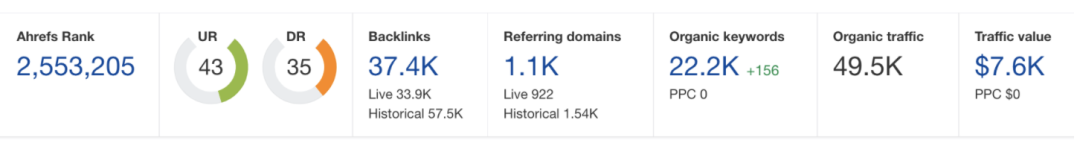 Ahrefs界面简洁清晰,可以一眼望过去就知道一个页面哪里需要优化。比如我们打开一个页面,关键词数据和外链等数据我可以很快就能知道他要怎么来做优化。