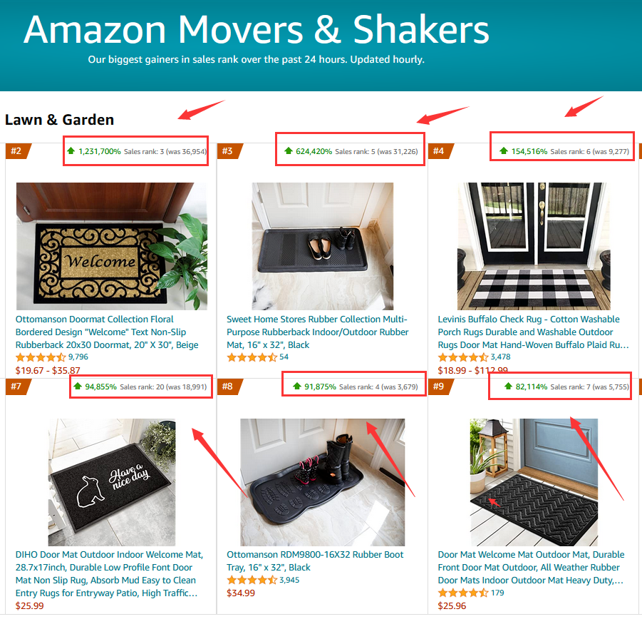 在亚马逊庭院、草坪和园艺销量排行榜中,其中一个地毯产品从原先的大类几千名外,完成了1231700%的增长,直接飙升到了大类第2名,其他同类产品也均达到了几千倍的增长。