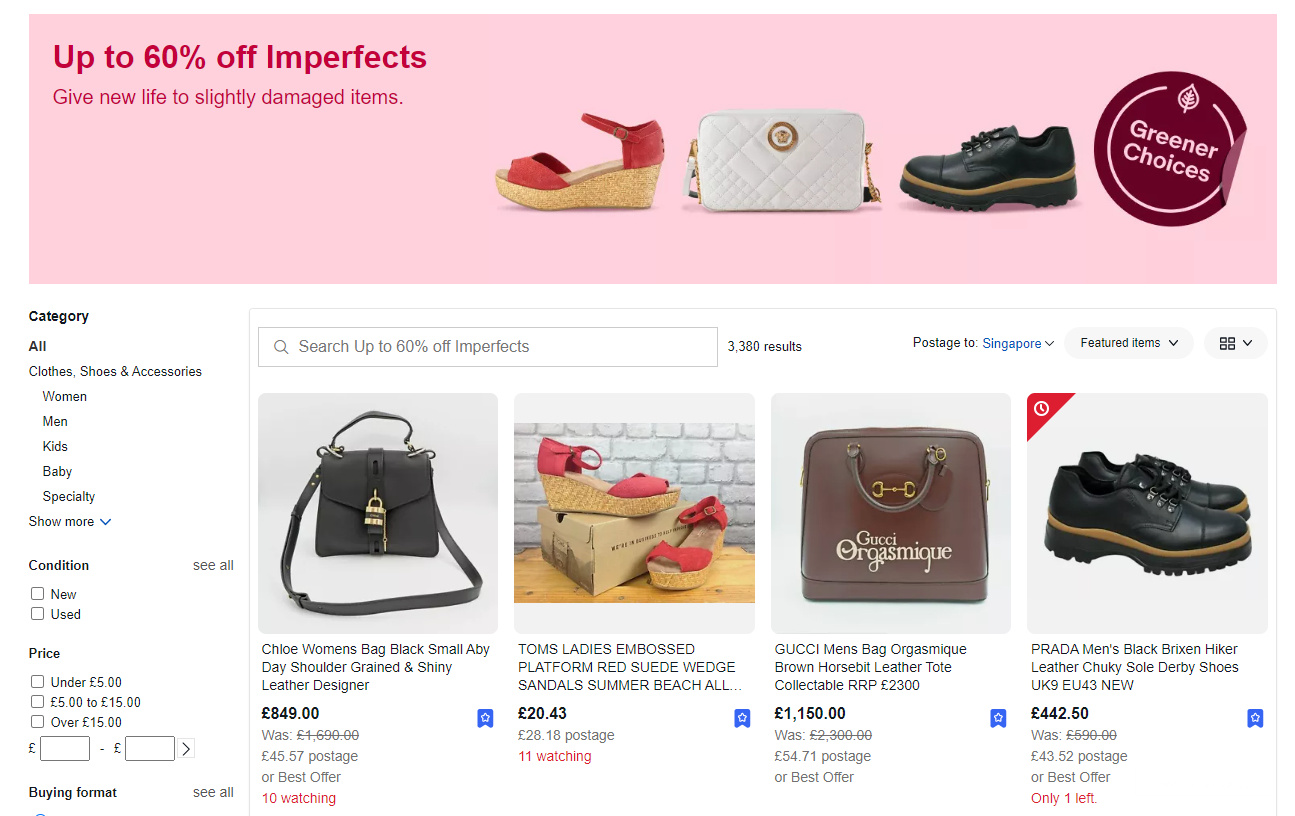 eBay123获悉,近日eBay UK宣布推出"Imperfects"市场,将与100多个高街和高端品牌合作,例如North Face、Off White、Puma,出售有轻微瑕疵的衣服、鞋子或配件,并提供60%的折扣,以纪念2022年4月22日的地球日。