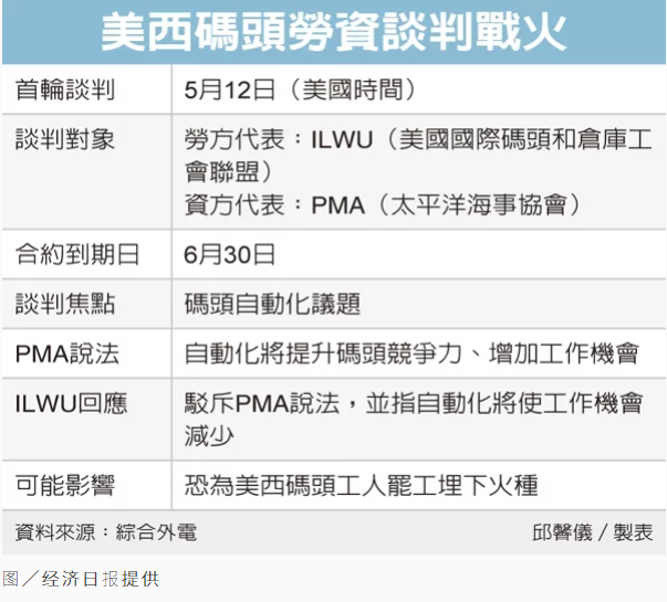 美西码头工人合约谈判本周四(美国时间12日)登场,代表资方的组织PMA(太平洋海事协会)上周释出「自动化可增加工人工作机会」的说帖,进一步激化劳资双方对立,为罢工的可能性埋下火种,运价恐受刺激翻扬。