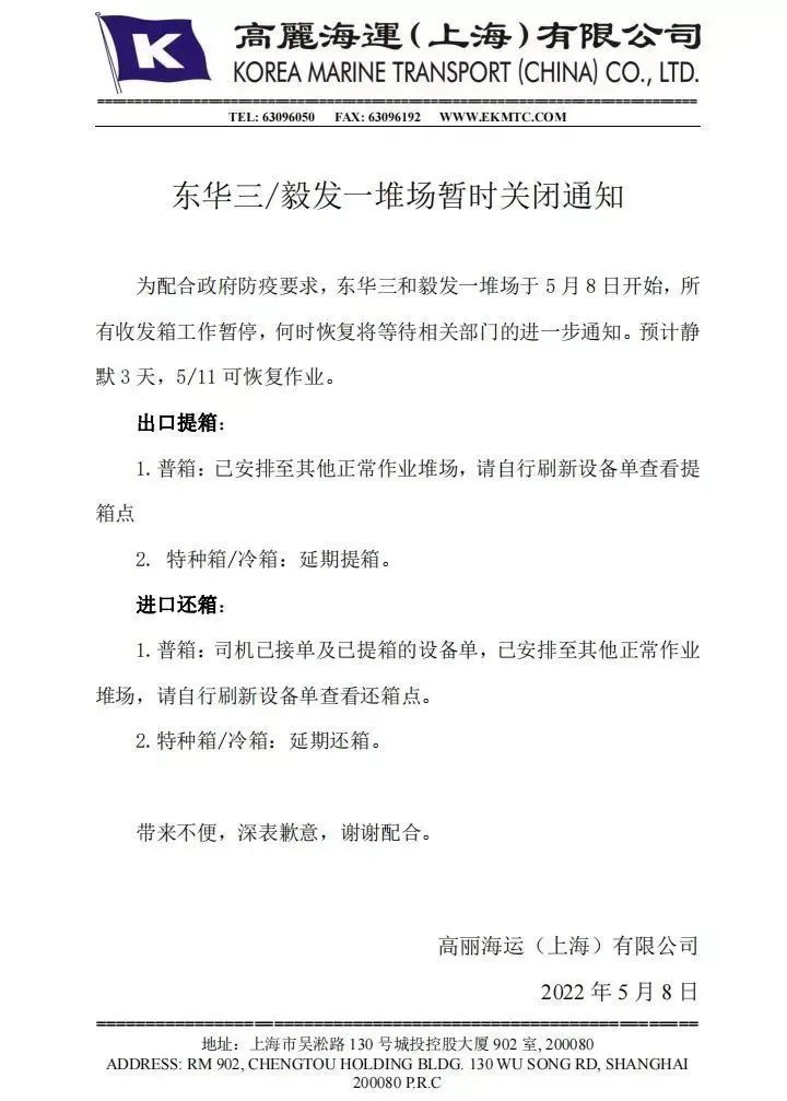 5月8日,高丽海运发布《东华三/毅发一堆场暂时关闭通知》。通知表示,为配合政府防疫要求,东华三和毅发一堆场于5月8日开始,所有收发箱工作暂停,何时恢复将等待相关部门的进一步通知。预计静默3天,5/11可恢复作业。
