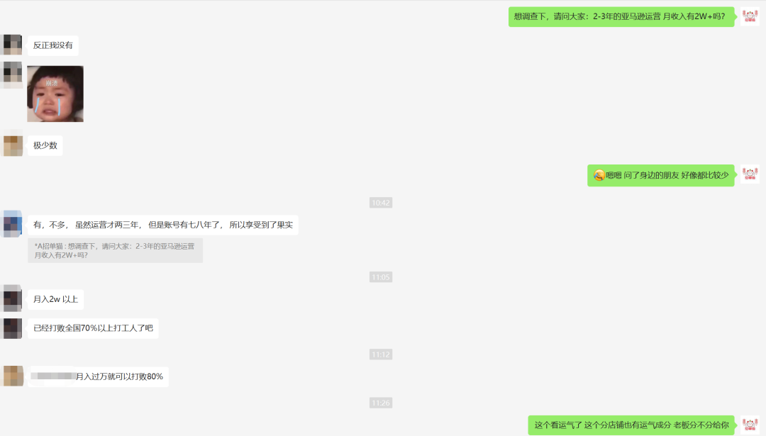 为了验证数据的准确性,招单猫在交流群里询问了一些运营的收入情况:大部分的卖家都说自己做了2-3年的亚马逊运营,还没有达到2万元的高收入。