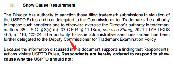 美国商标局列举出这家代理公司的四个问题,并要求他们给出一个书面解释(Show-cause),不然这几家代理公司将面临以下严重的后果。