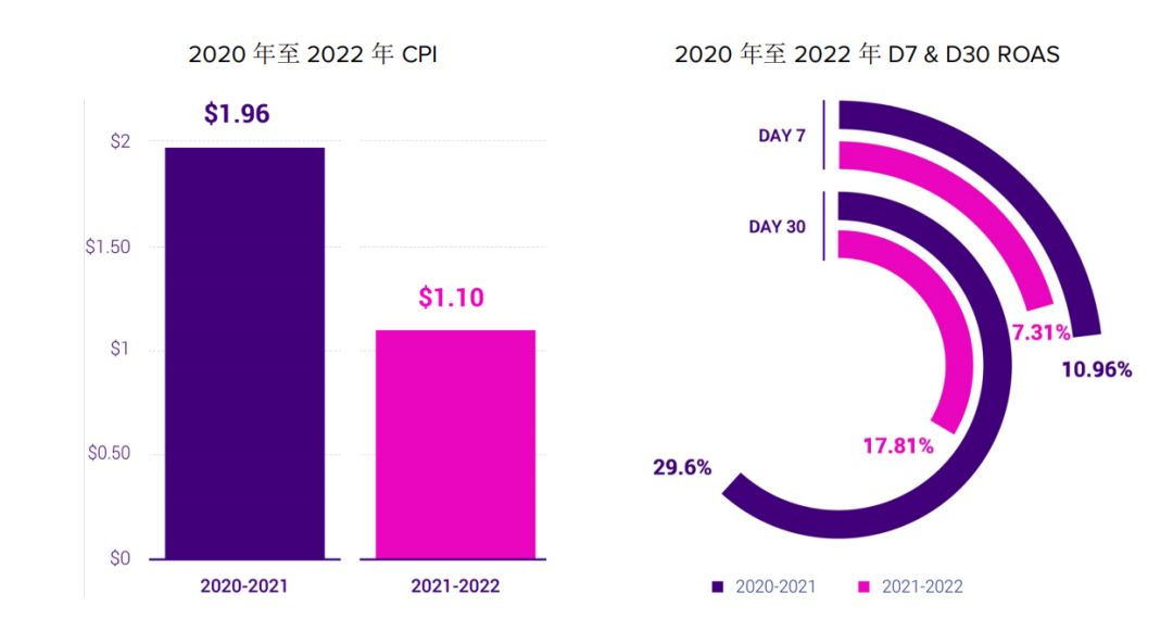 根据报告,2021 年 5 月至 2022 年 5 月,休闲游戏的 CPI 为 1.10 美元,对比上一年度的 1.96 美元下降非常明显。