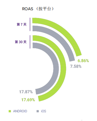 这篇报告也指出,目前休闲游戏在安卓端投放具有很高的可行性,报告指出,休闲游戏在 iOS 端的买量成本是安卓端的近 3 倍,二者在 ROAS 上却表现相近。