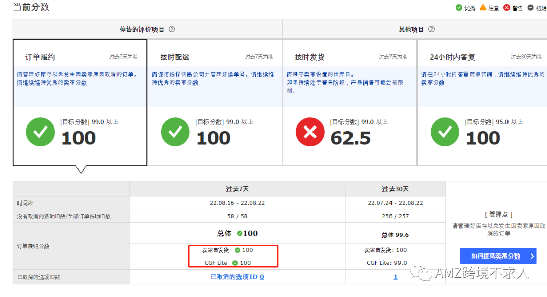 2、如果整体分数(根据所有卖家自发货,CGF和CGF LITE订单评估)持续处于警告,所有商品可能会被禁售。