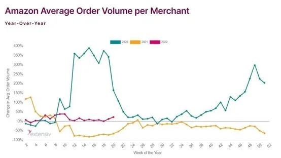根据折线图显示,疫情初期,因为线下消费受到限制,消费者开始转向在线购物,电子商务迎来了蓬勃的发展期,亚马逊卖家的平均订单量有了大幅增长。