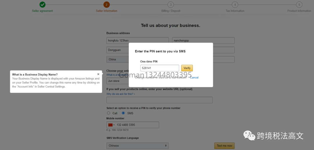 包括填写营业执照地址、卖家名称、联系方式、进行电话/短信认证验证码