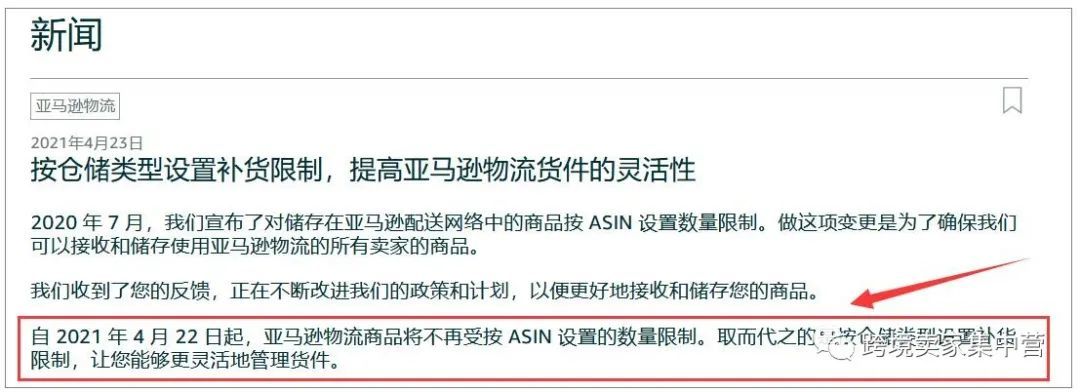"自2021年4月22日起,亚马逊物流商品将不再受Asin设置的数量限制,取而代之的,是按仓储类型设置补货限制,让您能够灵活的管理货件"。