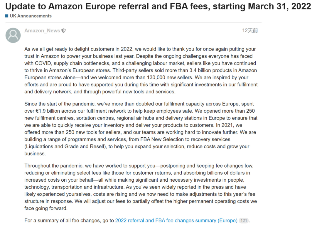 回首去年,水涨船高的运费成为卖家利润缩水的重要推手,而在2021接近尾声之际,亚马逊美国站又宣布将从22年1月起调整FBA配送费、仓储费等多项费用,重拳出击卖家本就不富裕的家庭。 而2022才开局不久,"战火"很快又蔓延到其他站点,近不久欧洲站同样发布了FBA配送费用的变更公告。 自2022年3月31日起,亚马逊欧洲站FBA配送费将进行如下调整: