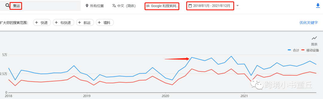 GOOGLE行业数据搜索趋势,从原来的不足2万月均,一下子陡升到5万+,这要得益于疫情,疫情阻隔了海外留学生、海外华人,刺激了市场的爆发,而且在2020年,疫情下的口罩、酒精、洗手液等物品的运输需求,以东南亚的华人聚居地、美国唐人街、澳洲华人聚集地为代表的地区率先开始了集运市场的争夺。集运也就在这种情况下逐步受到行业更多人关注