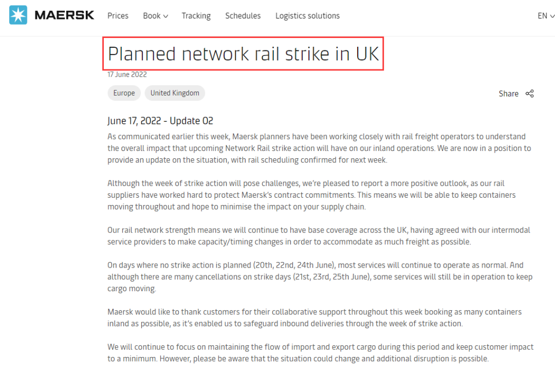 马士基还提醒客户,受罢工影响,英国铁路运输可能有意外中断的风险。