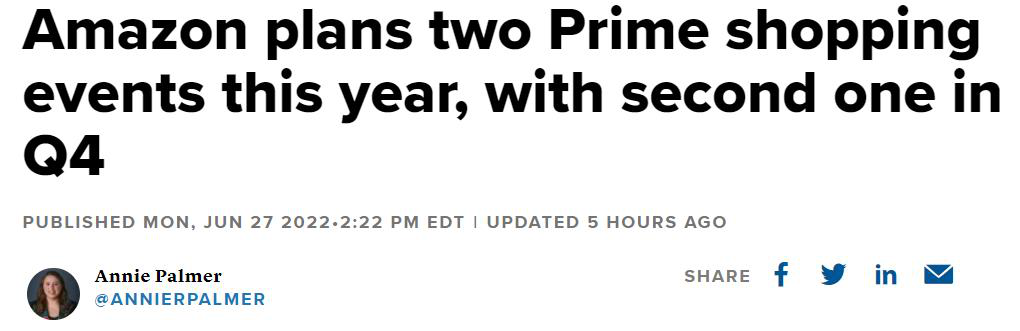 为了一探究竟,侃哥也去调查了一番。发现除了 CNBC 爆料外,另一家美国主流媒体 Business Insider 早前也曝出了"亚马逊今年将举办一场新的 Prime 大促"的消息,更是抛出 Prime Day 2.0的推测。