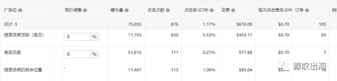 上图没有显示ACOS,但是我们也能判断出来,顶部的转化率最高,且单次点击费用低于其余位置,所以如果能将其余位置的预算挪给顶部使用,理论上来说就可以用更少的预算带来更多的出单。