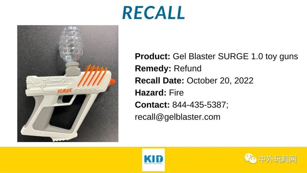 近日,美国消费品安全委员会(CPSC)发出公告称,Gel Blaster Inc.公司与其合作召回旗下Gel Blaster SURGE Model 1.0. 型水弹枪。召回公告显示,公司共收到30份锂离子电池所在的水弹枪手柄冒烟或着火的报告,幸无人因此受伤。因此,自愿召回该型号产品。